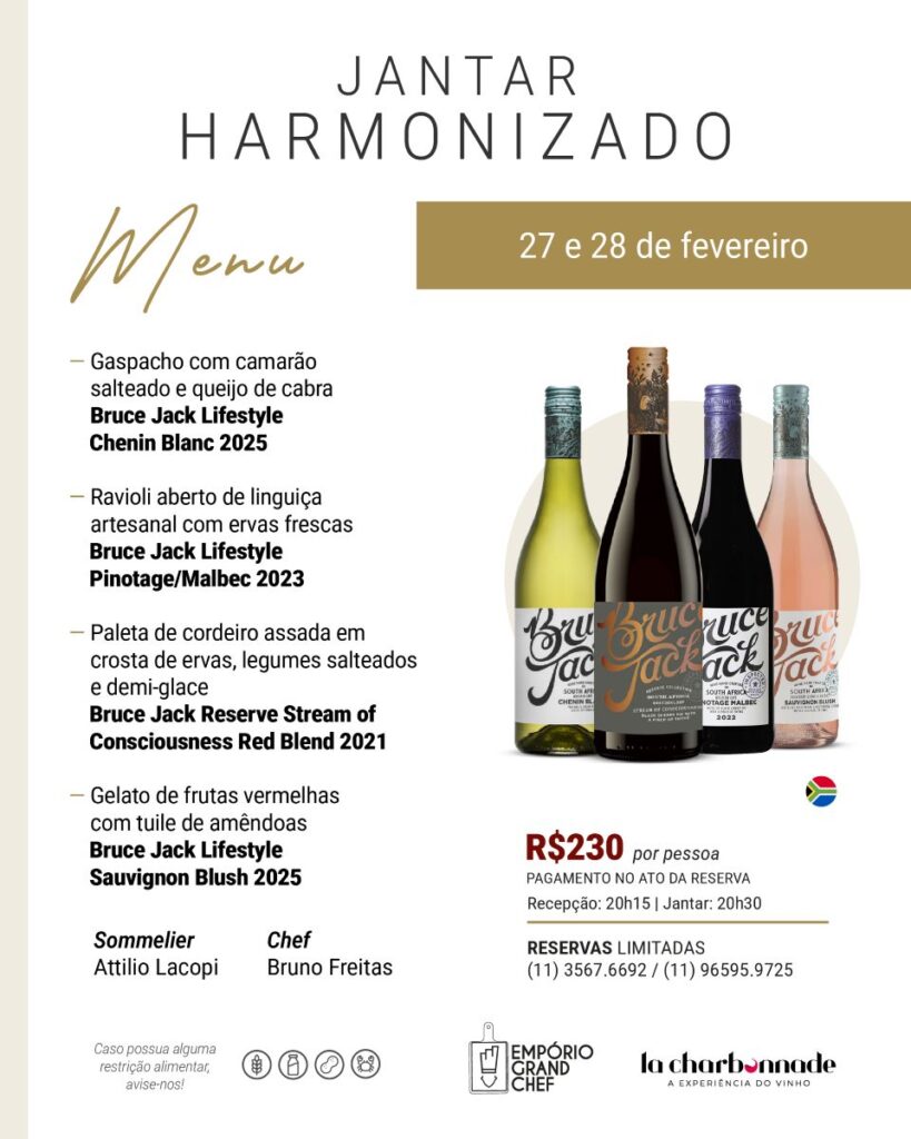 Com vinhos de Portugal, o menu apresentou Polvo à Lagareiro para começar. Chanfana de Cordeiro com Mandioquinha Torneada e Shitake e Queijo e Chouriço Português como pratos principais. A sobremesa foi Tarte de Amêndoas para finalizar a harmonização.